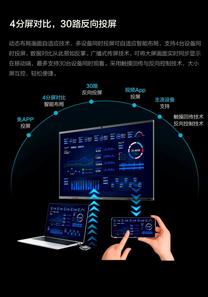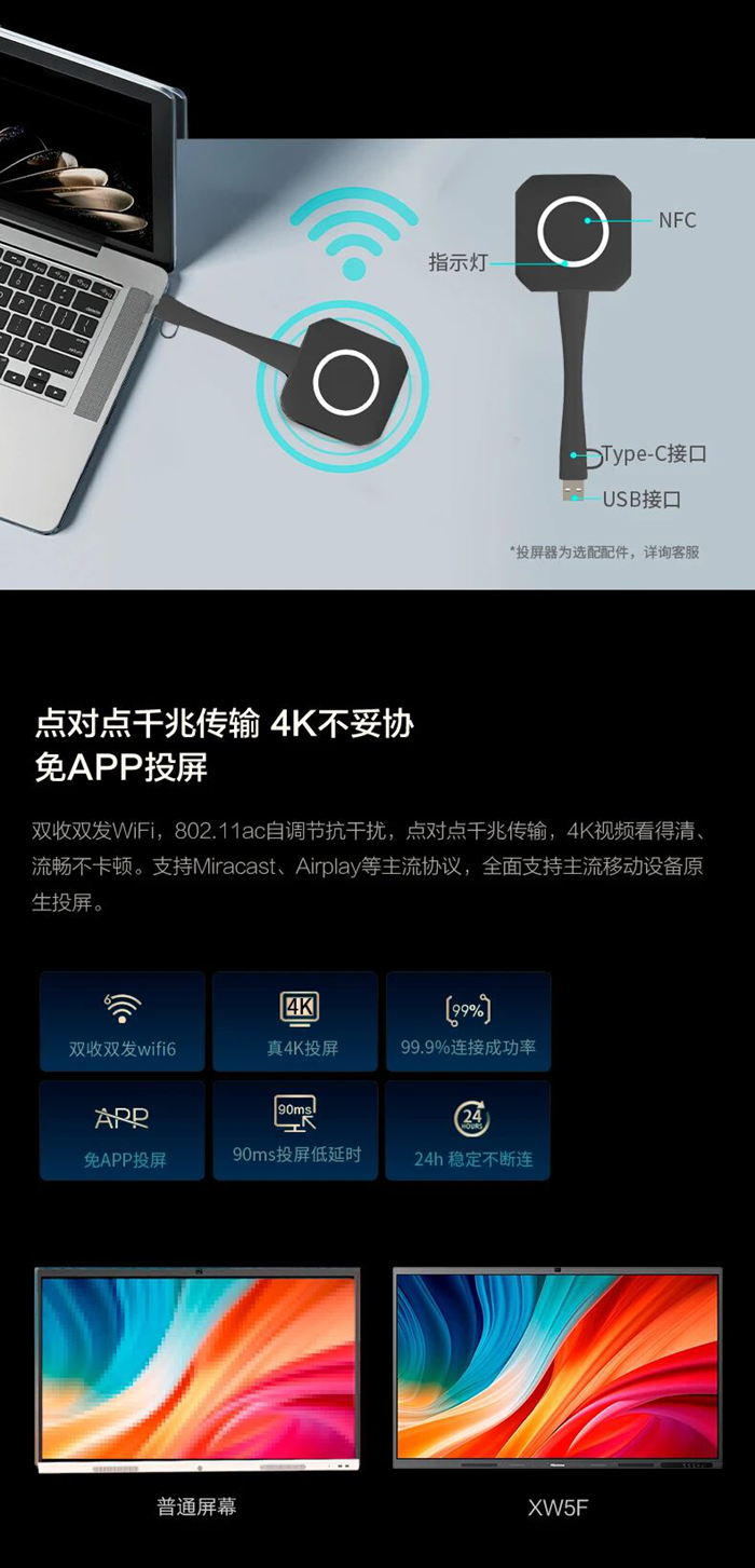 支持Type-C免驅(qū)投屏及Miracast、Airplay等主流協(xié)議,無論是筆記本電腦、手機(jī)還是平板,均可實(shí)現(xiàn)“一鍵秒投”,毫秒之間快速將內(nèi)容同步至大屏,讓討論焦點(diǎn)回歸內(nèi)容本身。